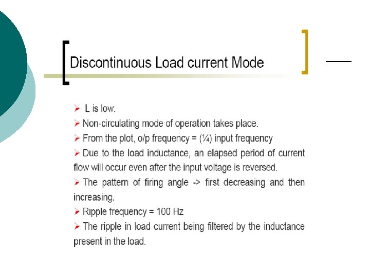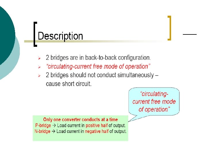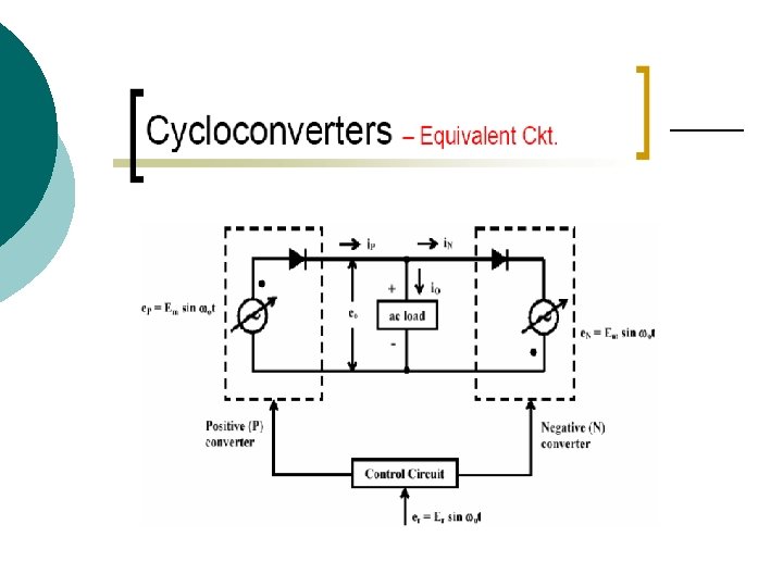 Phase-Controlled Cycloconverters (cont’d) At t=0, +ve load current is taken by the +ve converter only (i. P=i 0). From 0 -> /2, rising +ve load current will create a +ve voltage drop (v. L=Ldi 0/dt) in the primary winding of the IGR. This creates a -ve voltage drop in the secondary winding of the IGR -> DN reverse biased. no current flow in the -ve converter. At /2, i 0 peaks at Im-> v. L=0. After this v. L tends to reverse polarity inducing current in the -ve converter. Voltage across IGR becomes clamped to 0 -> self-induced circulation current between +ve and -ve converters.