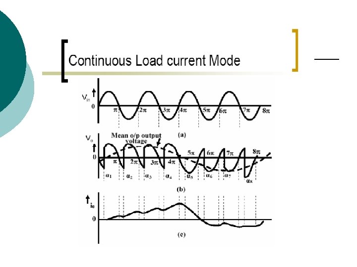 Phase-Controlled Cycloconverters (cont’d) Assume the +ve converter is operating in continuous conduction and is connected to a high inductance load and assume that the cycloconverter is operating at low frequency. Segments of the output current and voltage waves are as shown below: