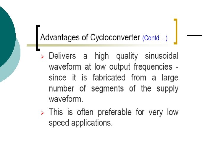 Phase-Controlled Cycloconverters (cont’d) Generator bus with regulated voltage but variable frequency (1333 -2666 Hz) is fed to the cycloconverter phase groups. (A generator speed variation of 2: 1 is assumed). The dual converter in each phase group uses a low-pass filter to generate a sinusoidal signal. modulator receives biased cosine waves from generator bus voltage and sinusoidal control signal voltages to generate thyristor firing angles.