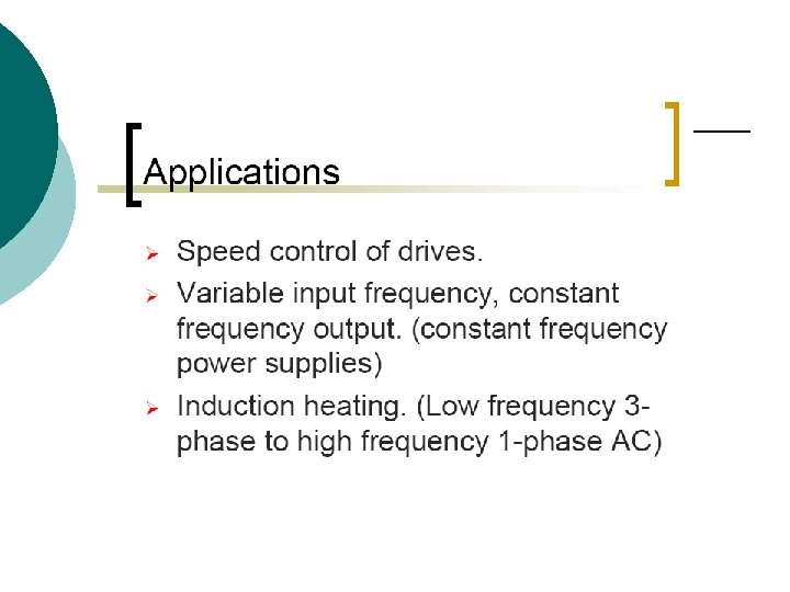 Phase-Controlled Cycloconverters (cont’d) An integral half-cycle output wave is created which has a fundamental frequency f 0=(1/n) fi where n is the number of input half-cycles per half-cycle of the output. The thyristor firing angle can be set to control the fundamental component of the output signal. Step-up frequency conversion can be achieved by alternately switching high frequency switching devices (e. g. IGBTs, instead of thyristors) between positive and negative limits at high frequency to generate carrier-frequency modulated output.