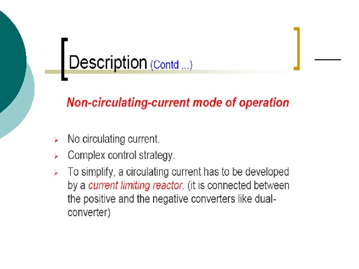 Phase-Controlled Cycloconverters (cont’d) The phase group of a cycloconverter can be operated in two modes: 1) Circulating current mode 2) Non-circulating current (blocking) mode In the circulating current mode, the current continuously circulates between the +ve and -ve converters. Although the fundamental output voltage waves of the individual converters are equal, the harmonics will cause potential difference which will result in short-circuits without an IGR.