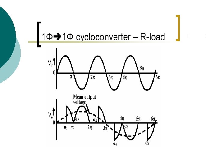 Phase-Controlled Cycloconverters (cont’d) A positive center-tap thyristor converter is connected in anti-parallel with a negative converter of the same type. This allows current/voltage of either polarity to be controlled in the load. The waveforms are shown on the next slide.