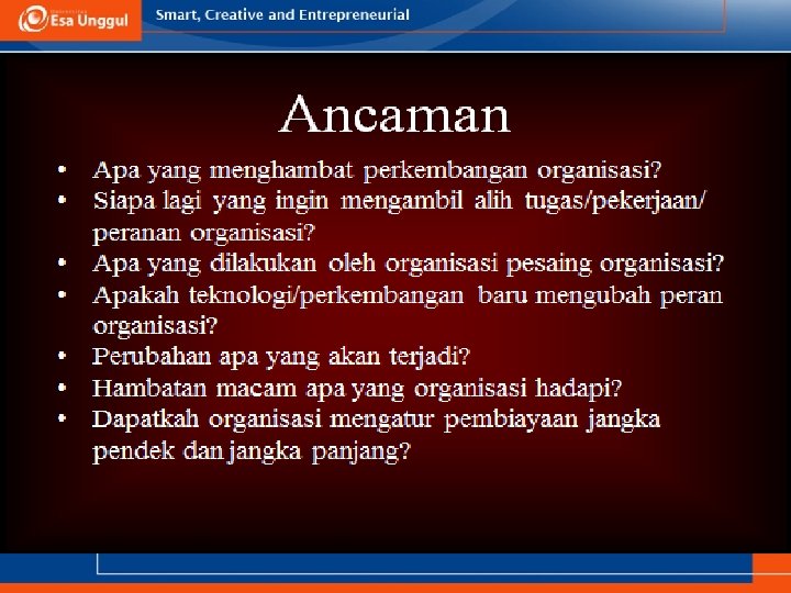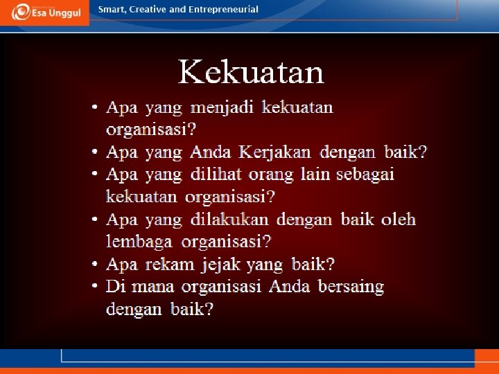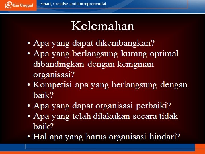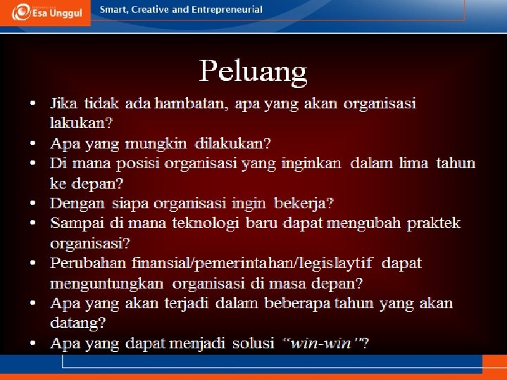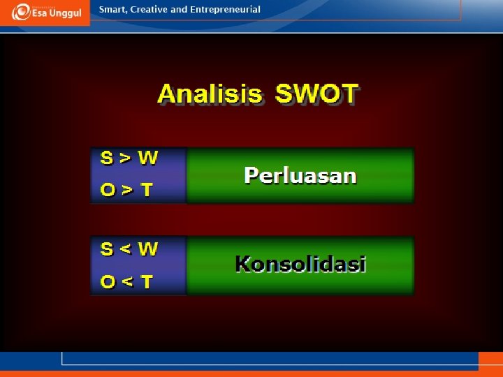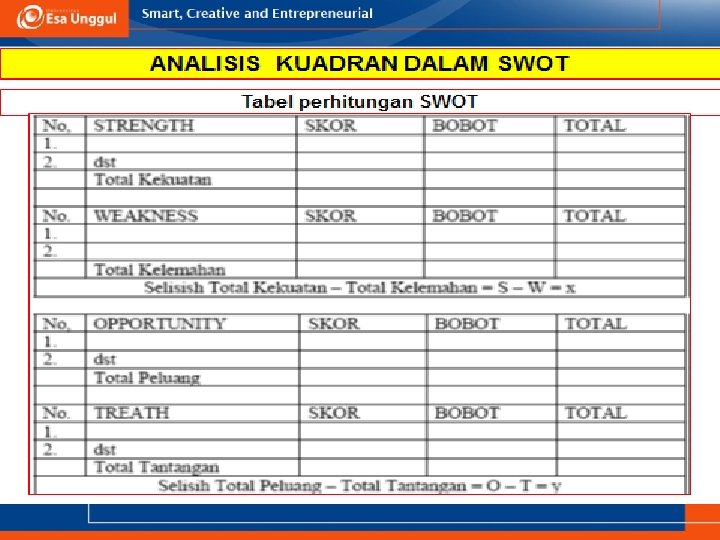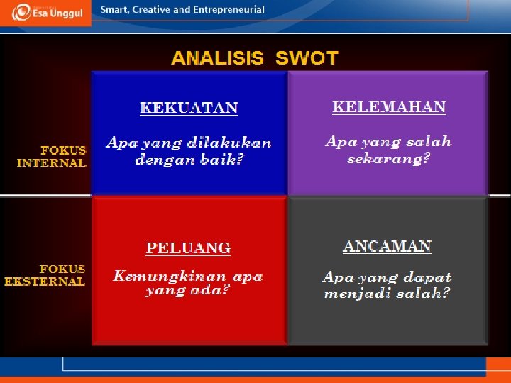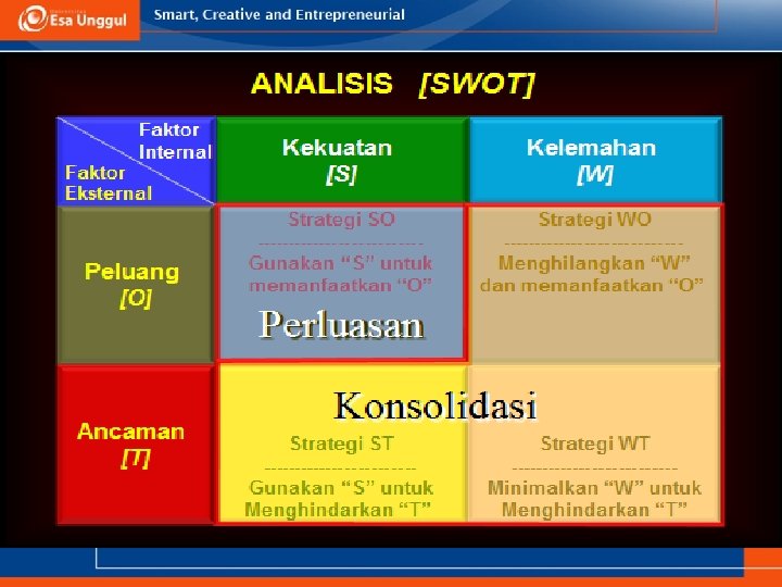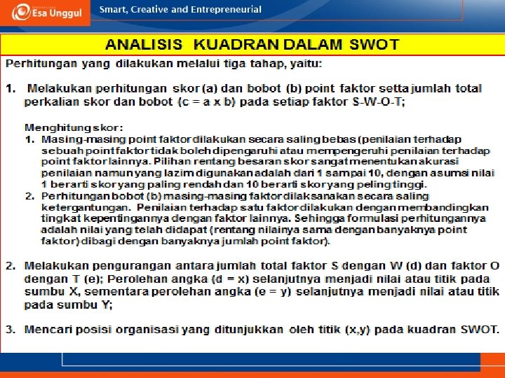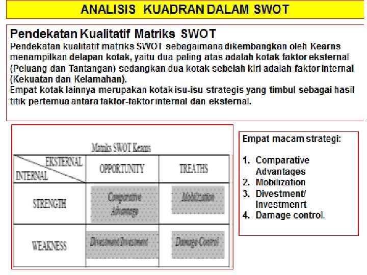 • Kuadran positif) III (negatif, Posisi ini menandakan sebuah organisasi yang lemah namun sangat berpeluang. Rekomendasi strategi yang diberikan adalah Ubah Strategi, artinya organisasi disarankan untuk mengubah strategi sebelumnya. Sebab, strategi yang lama dikhawatirkan sulit untuk dapat menangkap peluang yang ada sekaligus memperbaiki kinerja organisasi.