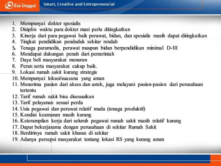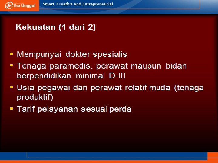 Strategi yang digunakan adalah mendukung strategi agresif yang bertujuan untuk memajukan program serta meminimalisir. kelemahan yang berasal dari sumber daya manusia (pekerja). Cara yang digunakan antara lain : 1. Meningkatkan mutu pelayanan dengan memperbaiki dan mengembangkan sarana dan prasarana yang ada. 2. Mengadakan pelatihan yang dikhususkan untuk para dokter, perawat, bidan tenaga kerja yang lainnya untuk memperbaiki kualitas SDM 3. Meningkatkan keamanan 4. Menetapkan kebijakan baru yang mendukung perkembangan Rumah Sakit