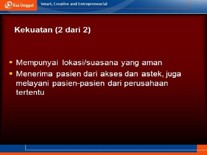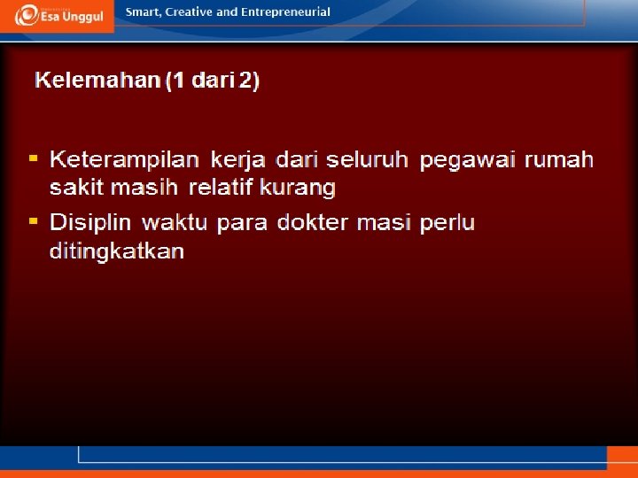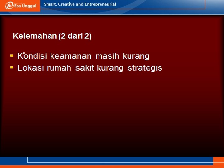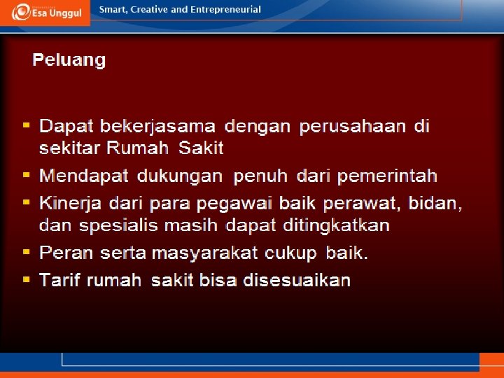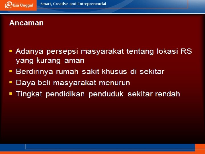 Hasil Analisis SWOT Berdasarkan hasil analisis dapat diketahui bahwa Rumah Sakit Sehat terletak di kuadran I artinya strategi pertumbuhan cepat / agresif. Kuadran I merupakan situasi yang menguntungkan karena rumah sakit memiliki peluang dan kekuatan yang baik dan bisa dioptimalkan dengan cara meminimalisir segala kelemahan dan ancaman.