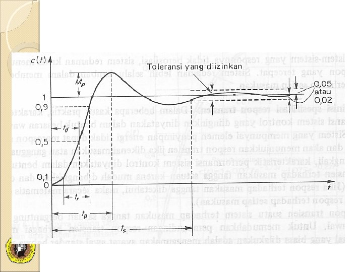 SPESIFIKASI TANGGAP TRANSIEN � Tanggap transien sistem kendali sering menunjukkan osilasi terendam sebelum mencapai keadaan tunak. � Karakteristik tanggap transien sistem kontrol terhadap masukan unit tangga, dinyatakan dalam parameter: ◦ Waktu tunda (delay time) td ◦ Waktu naik (rise time) tr ◦ Waktu puncak (peak time) tp ◦ Lewatan maksimum (maksimum overshoot) Mp ◦ Waktu penetapan (settling time) ts