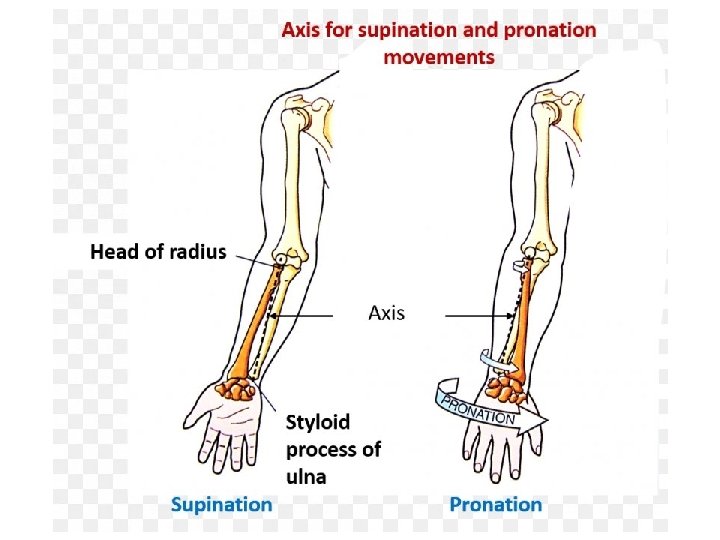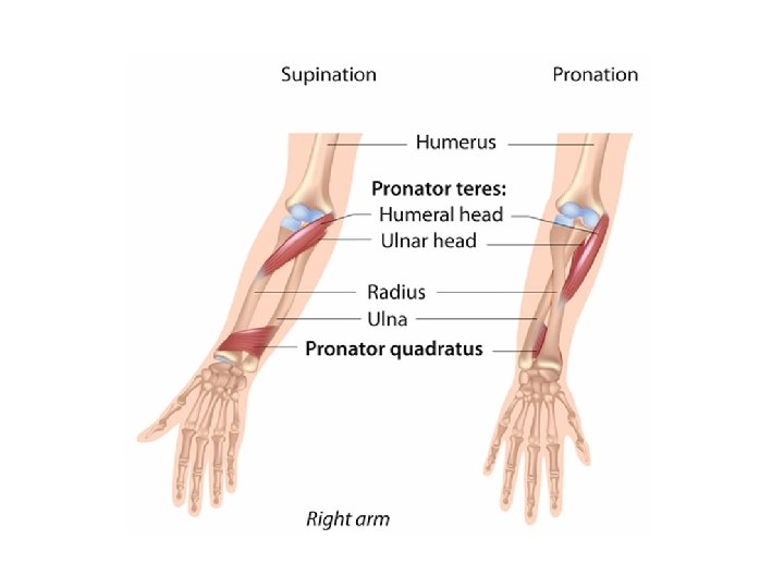 • Izvedite pokret PRONACIJE podlaktice. Razmislite • Što se događa u tom pokretu? • Gdje bi se mogli nalaziti mišići koji izvode taj pokret? • Kako moraju biti smješteni, u odnosu na zglob, da bi mogli izvesti ovaj pokret?