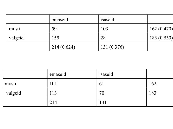 Analüüsid diskreetsete muutujatega Andmed tekivad loendamise, mitte mõõtmise teel. Ära hakka jõuga allutama pidevate muutujate meetoditele! Ühemõõtmeline sagedustabel, siin 1 x 2, lahtrite arv reas ei mõjuta mõõtmelisust. Ühemõõtmelise puhul testime klasside arvukuse suhte erinemist etteantust, 1: 1 või muu: erineb 1: 1 st: ( = 19, 9; p<0, 0001), ei erine 0, 6: 0, 4 -st, ( = 0, 59; p=0, 44)