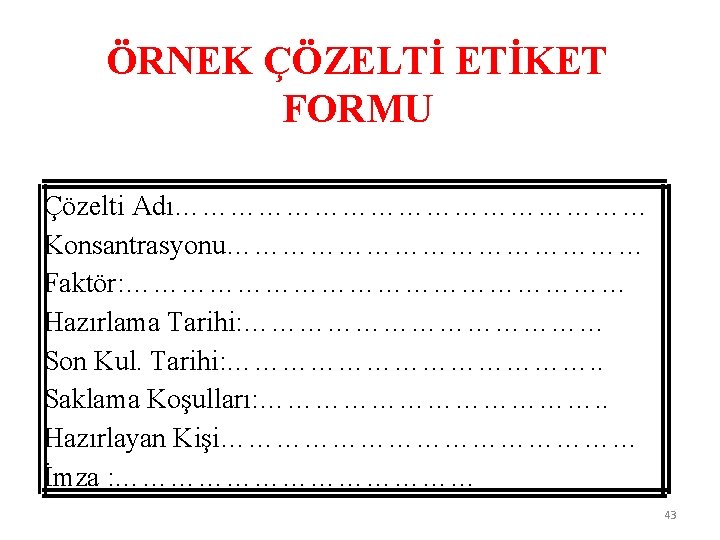 Etiketleme*** • 1. Kimyasallar, numuneler, çözeltiler mutlaka • • • etiketlenmelidir. Etiket üzerinde, Hazırlanma tarihi, Saklama süresi, Numune sahibi, Çözeltinin/numunenin özellikleri Konsantrasyonu ve diğer gerekli olabilecek bilgiler yer almalıdır. 2. Numunenin/çözeltinin yeni bir kaba aktarılması durumunda da yeni kabın etiketlenmesi unutulmamalıdır. 42