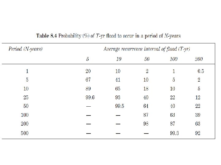 Once the frequency curve is developed, the probability of exceeding certain rainfall amount over a specified period can be determined Even if a flood of a long recurrence interval is chosen, there is always a possibility that the flood can be exceeded more then once during the interval The probability that an event with probability p will be equaled or exceeded x times in N years is determined by: If x=0 (no occurrence in N years) then Prob (no occurrence in N years) = (1 -p)N Therefore; Prob (at least 1 occurrence in N years) = 1 -(1 -p)N Q: the probability of having a 24 hr rainfall event of 100 mm or greater over a 20 year period is?