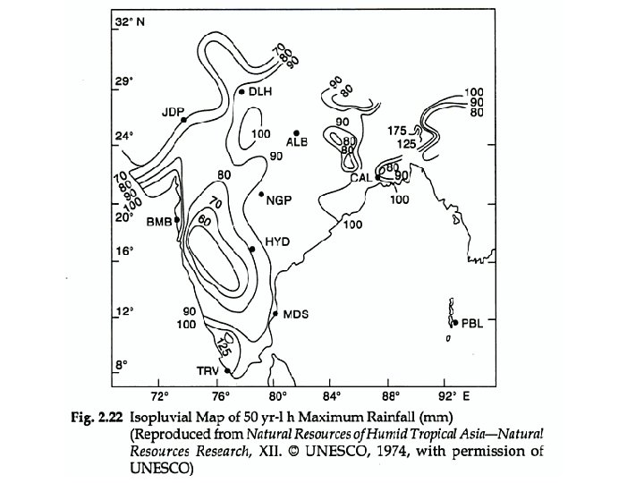 Isopluvial Maps Combined map for large area for maximum rainfall depth for various combination of a return period and duration These are Isohyets shown on regional rainfall map