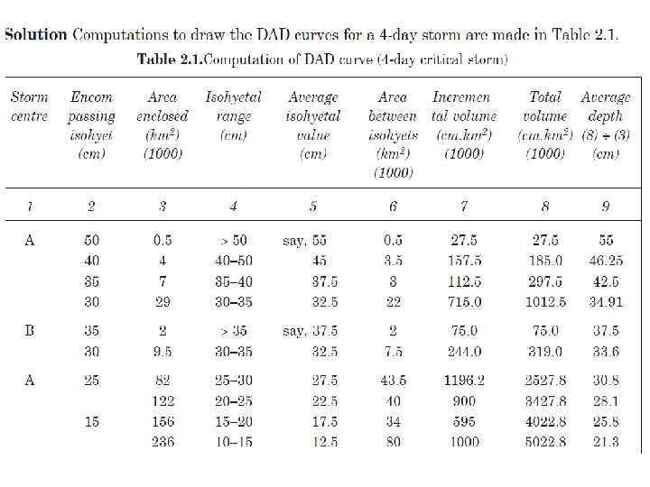 Depth-Area-Duration (DAD) Analysis Average depth of storm and its duration for a specific area Also called DAD study Horton’s Equation Pa =Poe-(KA)^n