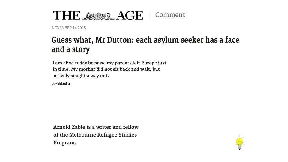 Zable: Sample Analytical Extract The bold, unequivocal headline ‘Each has a face, a story” serves to individualise the plight of asylum seekers from the outset, cementing the foundation upon which Zable’s argument rests – that “individual faces” and “specific voices” must be heard in order to combat the psychological “threat” that the depiction of “a horde of people” poses. Moving swiftly to describe the experience of a “visibly moved” Peter Dutton in a refugee camp in Jordan, Zable exemplifies how meeting “entire families stripped of livelihoods and hope” has stirred the humanity of the Immigration Minister, leading him to “[reaffirm]” Australia’s intake – an action which is portrayed in Dyson’s accompanying image of Dutton accepting the hand of a bowed and supplicating refugee. The power of the human connection is thus underscored for the reluctant and sceptical reader, who may have previously aligned themselves with Dutton’s position. By juxtaposing the minister’s “welcome move”, however, with his “hardline stance” on refugees in our own region, Zable draws attention to a stark and uncomfortable contradiction in Dutton’s actions, rendered all the more powerful by his use of figures which highlight just how significant these numbers are , with “ 30, 000” being just under half that of the “ 80, 000” in Jordan. Whilst this may anger pro-refugee readers it also unsettles the more conservative reader who is left pondering this confusing dichotomy – supported graphically by the image which sees the caricature of Dutton discarding, with the sharp talons of a predator, a helpless refugee who is strikingly similar to the one being greeted by the minister.