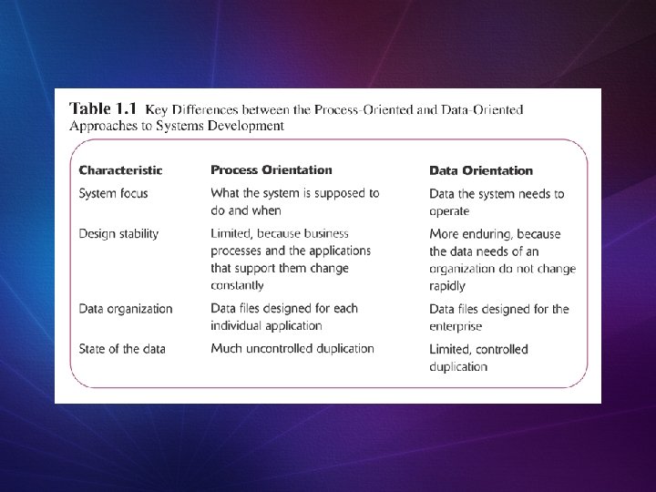 Approaches to Systems Development Data-Oriented Approach Depicts ideal organization of data, independent of where and how data are used Data model describes kinds of data and business relationships among the data Business rules depict how organization captures and processes the data
