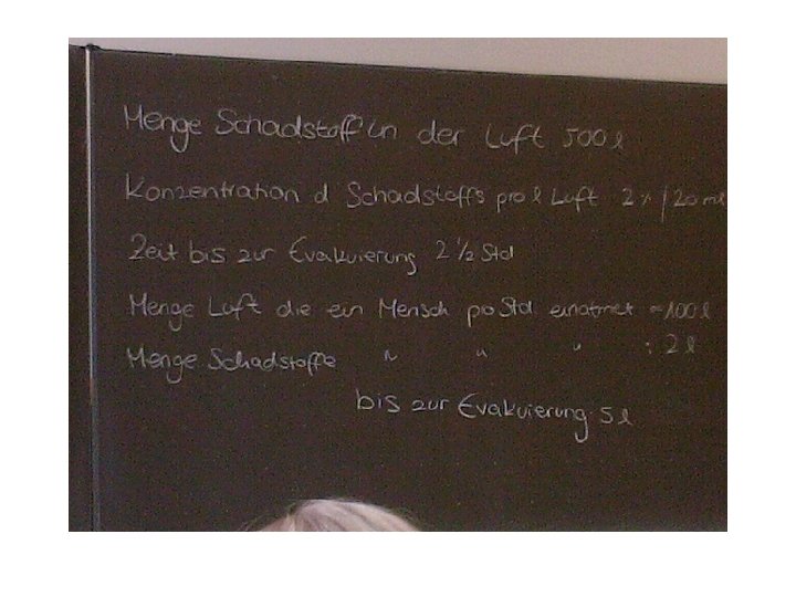 Menge Schadstoff in der Luft 500 l Konzentration d. Schadstoffs pro l Luft 2% / 20 ml Zeit bis zur Evakuierung 2 ½ Std Menge Luft die ein Mensch pro Stunde einatmet = 100 l Menge Schadstoffe " " " bis zur Evakuierung 5 l : 2 l