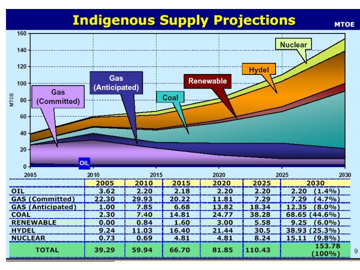 Gas • Geographical potential : 150 Trillion cubic feet • Proven: 29 TCF • Production Yearly: 1. 27 TCF • Consumption Yearly: 1. 05 TCF • Import plans: Iran 1045 TCF, Qatar 980 TCF, Central Asian etc.