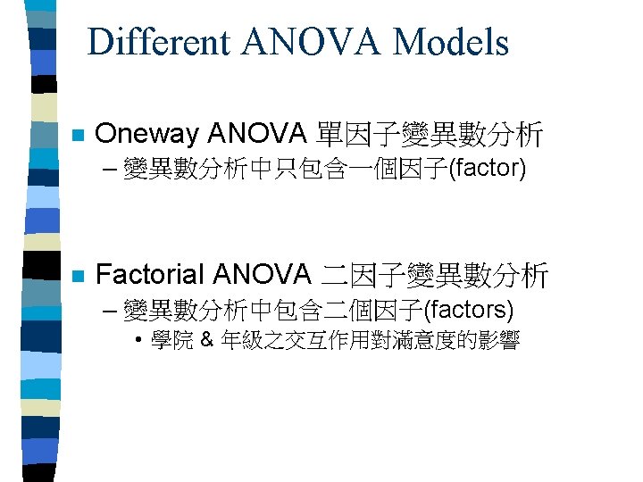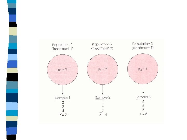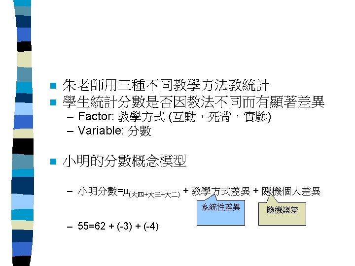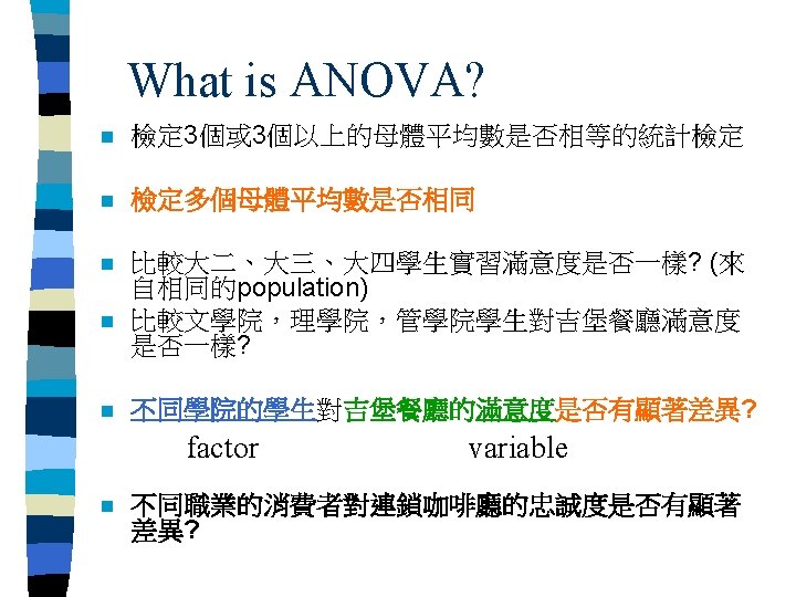 ANOVA 假設 n n n Ho: 1= 2= 3 or H o: j = k H 1: at least one population mean is different from the others. H 1: 不全等,至少有二個 不同, i不 全等 H 1: j ≠ k