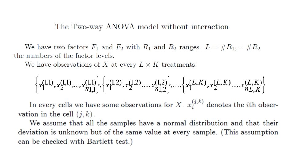 If we accept H 12 hypothesis, ie the interactions isn’t detected, we add QA, B to Qb and we count with Qb*=QA, B+Qb Then we check eg H 2 hypothesis with the test statistic If the hypothesis is true then it must follow F distribution with df 1=K-1 and df 2= K×L×N-L-K+1