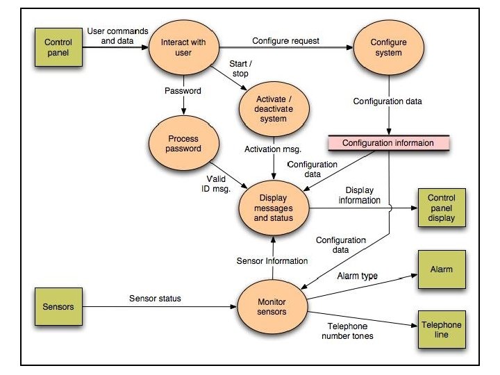 Processing narrative • The Safe. Home security function enables the homeowner to configure the security system when it is installed, monitors all sensors connected to the security system, and interacts with the homeowner through the Internet, a PC, or a control panel. • During installation, the Safe. Home PC is used to program and configure the system. Each sensor is assigned a number and type, a master password is programmed for arming and disarming the system, and telephone number(s) are input for dialing when a sensor event occurs. • When a sensor event is recognized, the software invokes an audible alarm attached to the system. After a delay time that is specified by the homeowner during system configuration activities, the software dials a telephone number of a monitoring service, provides information about the location, reporting the nature of the event that has been detected. The telephone number will be redialed every 20 seconds until a telephone connection is obtained. • The homeowner receives security information via a control panel, the PC, or a browser, collectively called an interface. The interface displays prompting messages and system status information on the control panel, the PC, or the browser window. Homeowner interaction takes the following form…