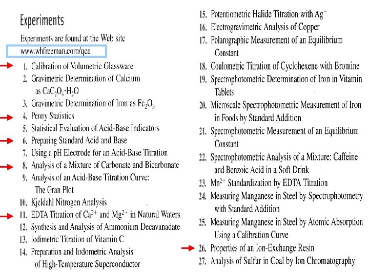Experiments: 1 2 3 4 Balance calibration; dollar statistics. Calibration of volumetric labware. Preparing standard acid and base. Analysis of a mixture of carbonate and bicarbonate. 5 Titration of bases in household drain cleaners. 6 EDTA titration of Ca 2+ and Mg 2+ in natural water 7 Capacity of ion-exchange resins