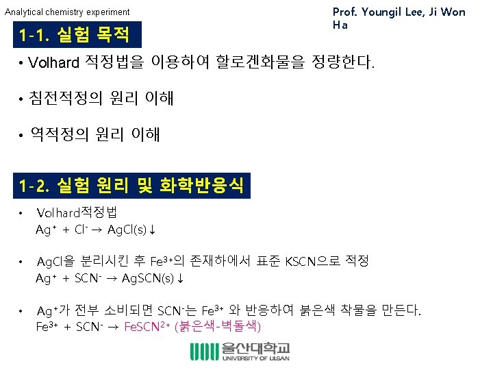 Analytical chemistry experiment Prof. Youngil Lee, Ji Won Ha Volhard 법에 의한 염화물 시료의 침전적정 (Determination of Chloride by a precipitation titration based on the Volhard Method)
