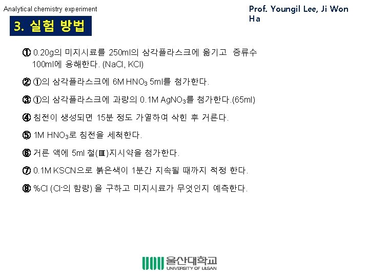 Prof. Youngil Lee, Ji Won Ha Analytical chemistry experiment 2 -1. 실험 기구 및 장비 • • Stand, Stirrer, Magnetic stirring bar Pipet Buret Flask 2 -2. 시약 및 용액의 제조 • • Potassium thiocyanate (98. 0%) Nitric acid (60. 0%) Silver nitrate(99. 8%) 철 지시약 • • 0. 1 M KSCN 수용액 제조 6 M HNO 3 수용액 제조 1 M HNO 3 수용액 제조 0. 1 M Ag. NO 3 수용액 제조
