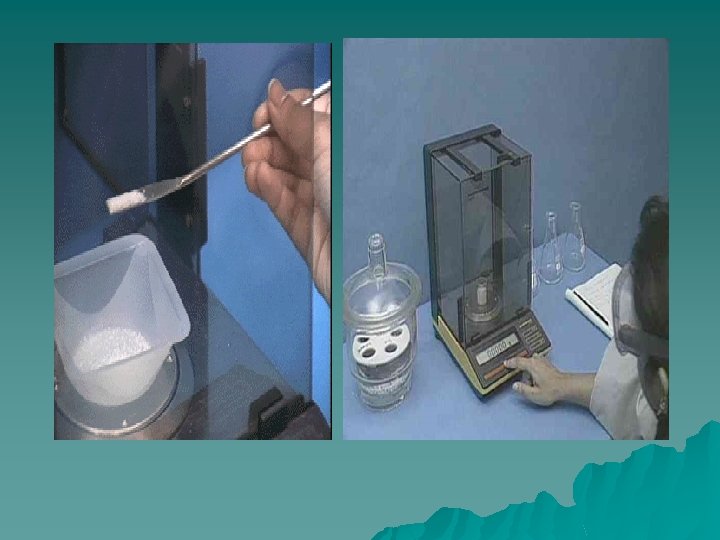8 - weighing: It is the process of using analytical balance to determine the precipitate and it comes ate the end of the practical steps for gravimetric analysis and that is after making sure the precipitate represents only one chemical compound and it must have a known and fixed chemical formula. 9 - calculation: The amount of the content is meaning to be estimated is calculated by the knowledge of the precipitate weight and gravimetric conversion factor or chemical factor which can be calculated as follow: Gravimetric conversion factor = wt. atomic or mwt for the content is meaning to be estimated mwt for the precipitate wt. atomic for( Cl) Gravimetric conversion factor = mwt (Ag. Cl) Wt(Cl) =Gravimetric conversion factor x wt for precipitate(Ag. Cl) x Gravimetric conversion factor (Cl) Cl / = x 100 wt of sample (Na. Cl)