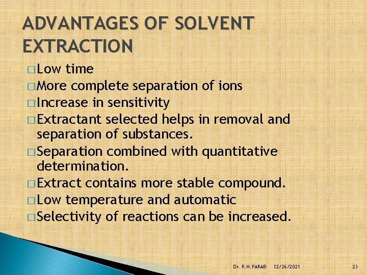 ADVANTAGES OF SOLVENT EXTRACTION � Low time � More complete separation of ions � Increase in sensitivity � Extractant selected helps in removal and separation of substances. � Separation combined with quantitative determination. � Extract contains more stable compound. � Low temperature and automatic � Selectivity of reactions can be increased. Dr. R. H. PARAB 12/26/2021 23
