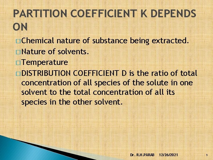 PARTITION COEFFICIENT K DEPENDS ON � Chemical nature of substance being extracted. � Nature of solvents. � Temperature � DISTRIBUTION COEFFICIENT D is the ratio of total concentration of all species of the solute in one solvent to the total concentration of all its species in the other solvent. Dr. R. H. PARAB 12/26/2021 9