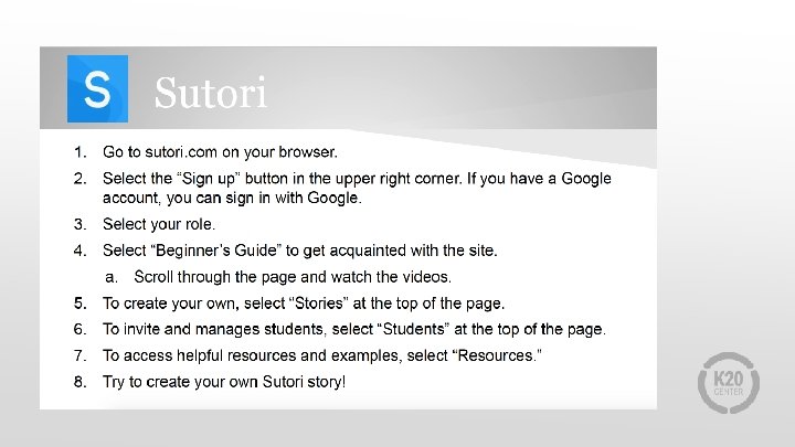 Sutori Gallery Walk 1. Share the link to your project in Google Classroom (or another collaborative workspace your teacher specifies). 2. Review and read through each peer project that you are assigned. 3. Comment on aspects that you love, and politely offer advice if you notice any issues.