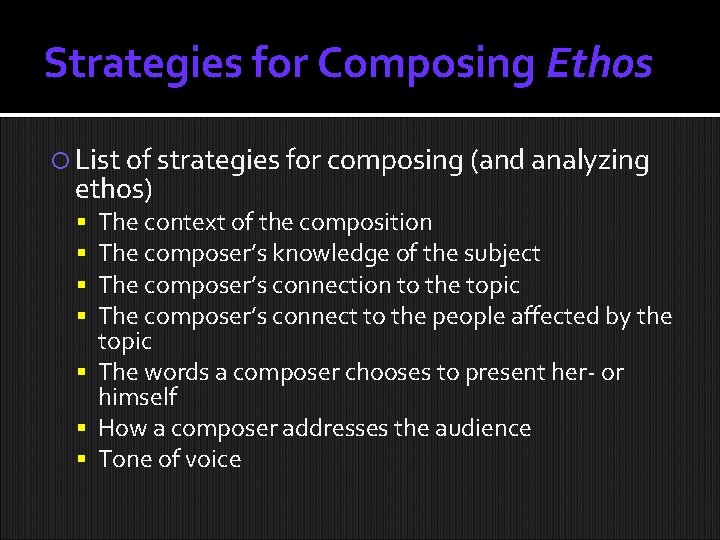 Strategies for Composing Ethos List of strategies for composing (and analyzing ethos) The context of the composition The composer’s knowledge of the subject The composer’s connection to the topic The composer’s connect to the people affected by the topic The words a composer chooses to present her- or himself How a composer addresses the audience Tone of voice