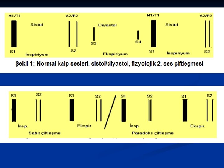 Fizyolojik sesler n n 1. kalp sesi (S 1): mitral ve triküsbit kapak kapanması 2. kalp sesi (S 2): aort ve pulmoner kapak kapanması