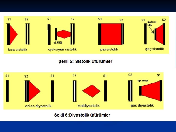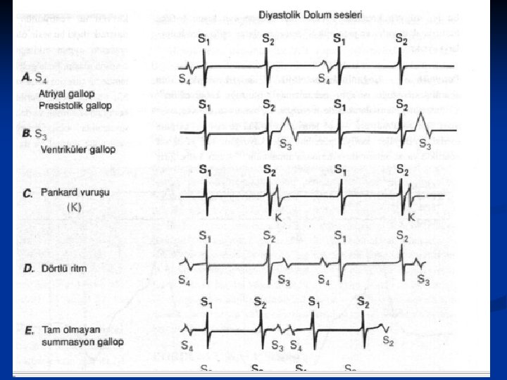Diyastolik sesler n S 3: erken diyastolik sestir. Hızlı ventriküler doluş fazında LV basıncının artışı ile duyulur. n n n S 3 en iyi sol dekübit pozisyonda kalbin apeksinde, steteskobun çan kısmı ile duyulur S 4: atriyal kasılma sonrası diyastolün geç safhasında işitilir. Juguler a dalgası ile aynı anda görülür (her zaman patolojiktir) Gallop ritmi taşikardi esnasında S 3 yada S 4 varlığı ile oluşan üçlü ritimdir Sumasyon gallopu (quadripl ritm) taşikardi esnasında S 3 ve S 4’ün süperpoze olmasıyla karakterize dir Mitral açılma sesi (OS): MD belirginleşen açılma sesidir. Perikardiyal knock: konstriktif perikarditte