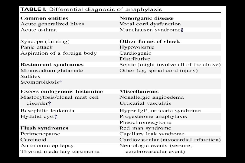 Anaphylaxis - Clinical Manifestations n n n Cardiovascular ¦ Tachycardia then hypotension ¦ Shock: ≧ 50% intravascular volume loss ¦ Bradycardia (4%) (transient or persistent) ¦ Myocardial ischemia Lower respiratory - bronchoconstriction wheeze, cough, shortness of breath Upper respiratory ¦ Laryngeal/pharyngeal edema ¦ Rhinitis symptoms