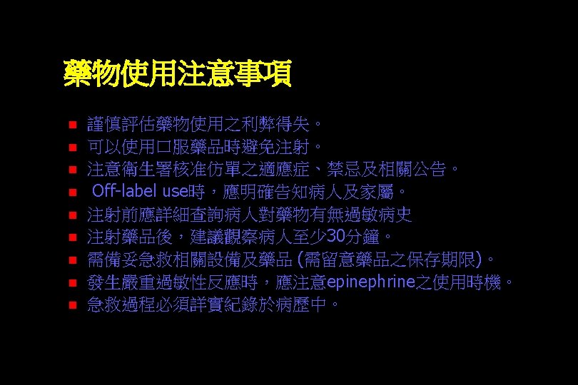 Anaphylactoid Reaction ¢ Ig. E-independent ¢ Clincially indistingushable from anaphylaxis ¢ 不建議使用