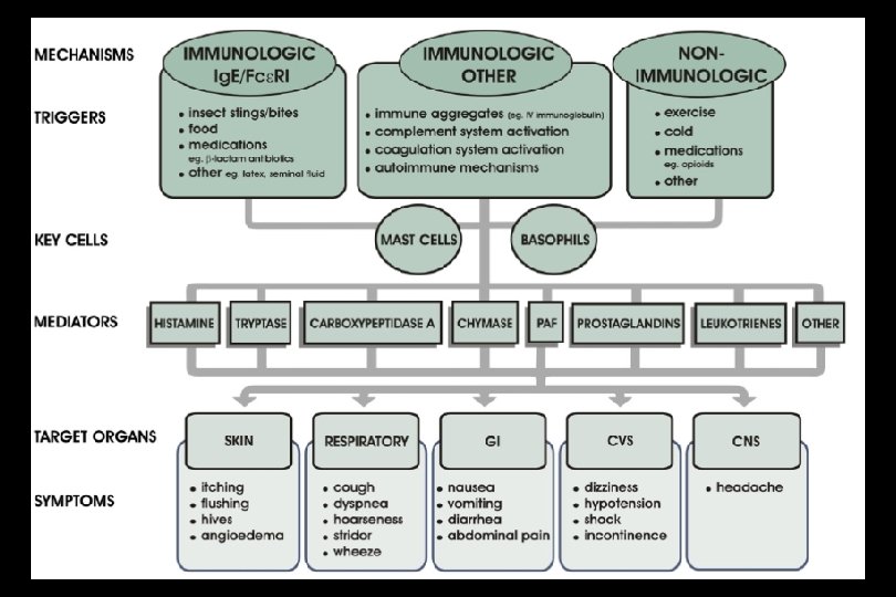 Mechanisms of Anaphylaxis n Complement activation ¦ Type II hypersensitivity ¦ Type III hypersensitivity ¦ Aggregated Ig Direct mast cell activation Drugs (e. g. ASA, vancomycin), exercise, cold, idiopathic n Ig. G-dependent (not proven in human) n