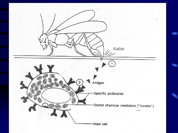 Sensitization Stage Antigen (allergen) exposure Antigen Plasma cells produce Ig. E antibodies against the allergen Plasma cell Ig. E antibodies attach to mast cells and basophils Mast cell with fixed Ig. E antibodies Granules containing histamine