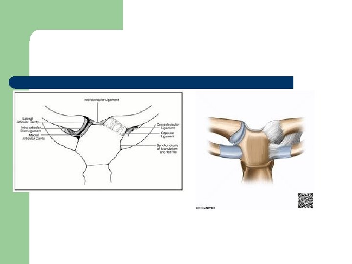 Art. Sternoclavicularis l Art. sellaris tipi eklemdir. Discus articularis’i vardır. Eklem kıkırdağı fibröz kıkırdak yapısındadır. Üst ekstremiteyi gövdeye bağlayan tek eklemdir. Discus articularis, clavicula’nın eklemden ayrılmasını önleyen en önemli faktördür.