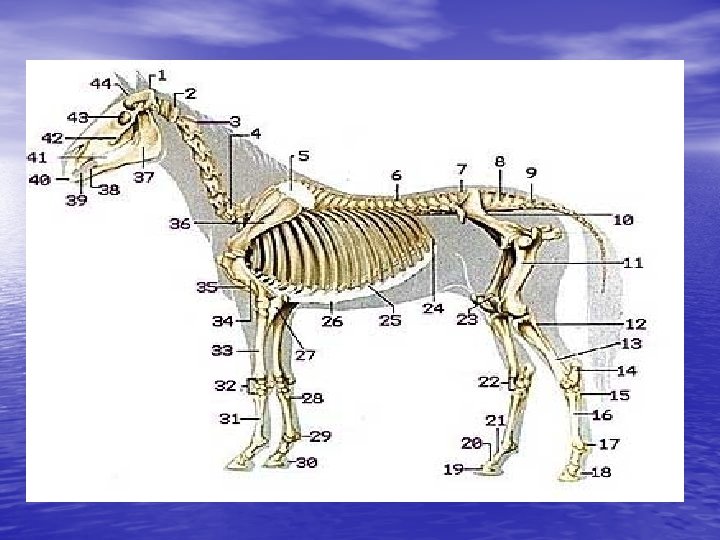 (1) encuesta (2) vértebra cervical de Atlas. (1 st) (3) eje (4) 7 ma vértebra cervical (pasada)(5) cartílago de Scapular (6) décimo octava vértebra torácica (pasada) (7) 6 ta vértebra lumbar (pasada). (8) sacro (9) 1 r 10) 11)12) peronés coccygeal del fémur de la pelvis de la vértebra(((. (13) Tibia (14) Calcaneus. (uno del tarsal huesos que forman la punta del vino del Rin) (15) Cañones trasero del hueso de la tablilla(16) (metatarsal 3) (17) Sesamoids. (18) Navicular. (19) 3 ro 20) 2 dos phalanx del phalanx (hueso del pedal o del ataúd) (pastern corto) (21) 1 ros huesos de Tarsal del phalanx (pastern largo)(22) (vino del Rin o tobillo) (23) rótula. (24) décimo octavos 25) cartílagos costales (pasados) de la costilla (. (26) Cúbito del cartílago de Xiphoid(27). (28) Cañones delantero del huesode la tablilla(29)Sesamoids. (30)Navicular. (31) (3) metarcarpal (32) Huesos de Carpal (técnico la muñeca pero siempre llamado 33) radios de la rodilla) (. (34) Omóplato Del Esternón Del Húmero(35)(36). (37) Mandíbula (38) Diastema. (barra) (39) (40)41) Mejillas. Canina De las Incisivos ( órbitas facial de la cresta de los dientes (42)43) (. (44) Cranium.