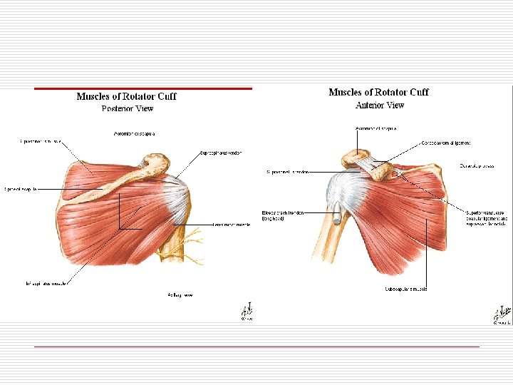 ROTATOR CUFF o Terdiri dari : M. SUPRASPINATUS, M. INFRASPINATUS, M. TERES MINOR, M. SUBSCAPULARIS o SEBAGAI STABILISATOR SENDI GLENOHUMERALIS. o PENGGERAK SENDI. o SERING TERJADI PATOLOGI DALAM OLAH RAGA, PEKERJAAN, ADL.