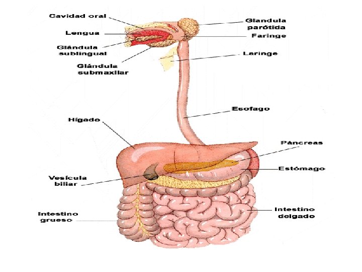 GENERALIDADES • • TUBO DIGESTIVO: Boca Faringe Esófago Estómago Intestino delgado Intestino grueso • • ÓRGANOS ACCESORIOS: Dientes Lengua Glándulas salivales Hígado Vesícula biliar Páncreas