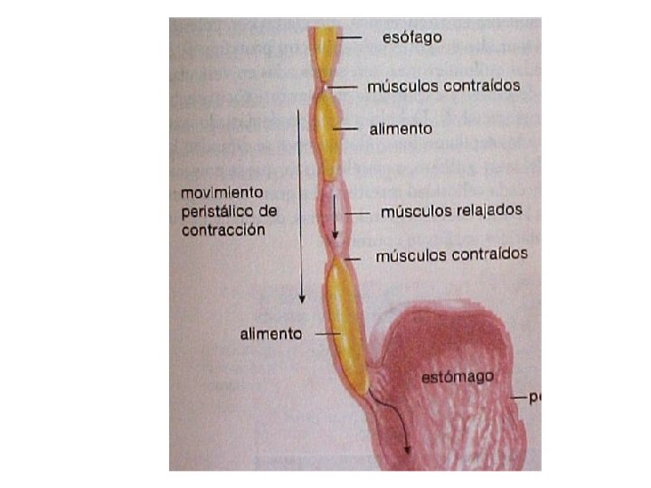 Esófago • Conduce el alimento al estómago • Es un tubo muscular “virtual” que impulsa los alimentos desde la boca hacia el estómago por medio de la peristalsis. • Termina en una válvula llamada cardias, que es a la vez la puerta de entrada al estómago.
