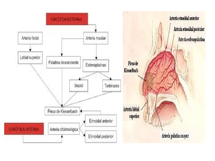 • Las fosas nasales por delante separadas por el tabique nasal, formado por los huesos nasales, espina nasal del frontal • Por la parte medial formados por la lámina perpendicular del etmoides, los cornetes del etmoides superior, medio e inferior • Las cavidades nasales son separadas de la boca por el paladar blando, el maxilar superior y la lamina cribosa del etmoides hace la separación del cráneo y nariz • Por la parte de atrás se abre a la rinofaringe. A la entrada epitelio escamoso grueso, que contiene glándulas sebáceas y pelos gruesos. Parte media epitelio seudoestratificado
