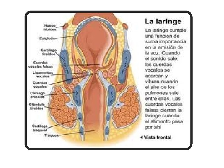 Laringe - Cuerdas vocales • Se componen de ligamentos elásticos y fibrosos, situados en los bordes de la abertura glótica, estos ligamentos están unidos a los cartílagos de la laringe = pliegues vocales (cuerdas vocales verdaderas e inferiores) = pdcn voz. Por arriba de ellas están los pliegues vestibulares = cuerdas vocales sup =son para conservar la humedad