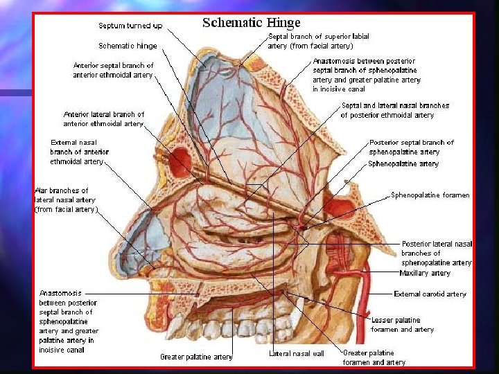 Artere - aa. etmoidale ant şi post din oftalmică - aa. nazale post. , lat. şi septale din a. sfenopalatină - a. facială (vestibul)