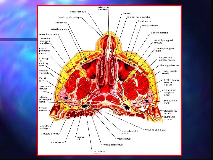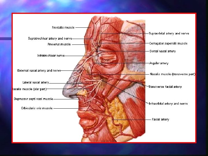 Stratigrafie Ø Pielea - caractere regionale + fire de păr glande sebacee sudoripare Ø Plan subcutanat – ţ. conj. lax Ø Plan muscular – m. piramidal nazal ridicătorul buzei sup. şi al aripiei nasului