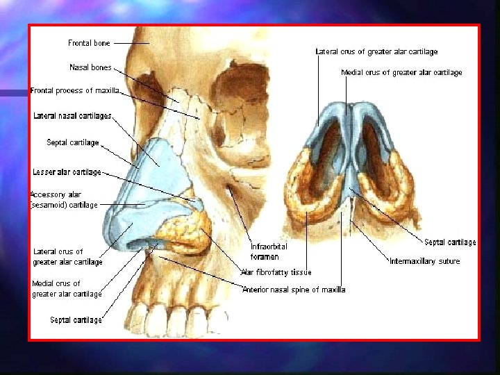 Vase şi nervi Artere - aa. facială şi dorsală a nasului (oftalmică) Vene - afluenţi - v. facială Limfatice- noduri parotidiene supeficiale şi submandibulare Nervi - nn. suborbitar (maxilar) - n. facial Ø Plan osteo-fibro-cartilaginos nazale maxila – proces frontal – spina nazală Ø Plan mucos