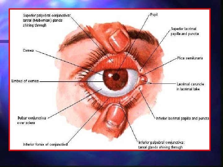 Importanţa clinică Patologie bogată Cale de explorare a bulbului ocular Limite - superficial marginile ADITUSULUI ORBITEI - profunzime conjunctiva palpebrală INCLUSIV Descriptiv: faţa anterioară - centrală - periferică faţa posterioară margine aderentă margine liberă - p. lacrimală medială - p. laterală CILIARĂ fanta palpebrală COMISURILE palpebrale unghiurile ochiului - CANTURILE LACUL LACRIMAL - CARUNCULA LACRIMALĂ - PLICA SEMILUNARĂ
