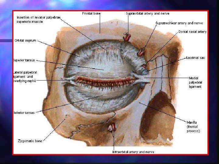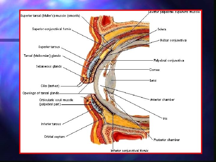 Plan fibros central TARSURILE – lig. PALPEBRALE - med. - lat. periferic SEPTUL → periorbite ! rel. cu creasta lacrimală post. ! tendonul ridicător al pleoapei sup. rel. cu dermul pleoapei sup. tarsul sup. Ø Plan muscular NETED – muşchi tarsali Ø Plan mucos CONJUNCTIVA PALPEBRALĂ Ø
