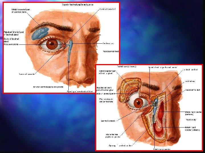 Aparatul lacrimal - glande lacrimale - fornixul conjunctival superior - lacul lacrimal - căile lacrimale puncte lacrimale canalicule lacrimale sac lacrimal duct nazo-lacrimal